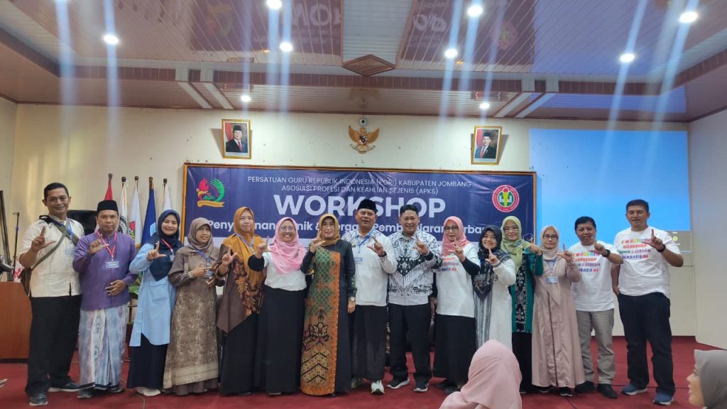 Jombang, 17 Oktober 2025 – Gemuruh tepuk tangan dan suara yel-yel APKS PGRI membahana di ruangan Aula Tutwuri Handayani gedung PGRI Jombang. Pagi itu, tanggal 16 Oktober 2025, pukul 6.45 lobi panitia telah dipenuhi oleh para peserta workshop yang terlihat sangat haus ilmu. Workshop kekinian yang mengambill tema “PENYUSUNAN KOMIK DAN CERGAM PEMBELAJARAN BERBASIS AI” dipandegani oleh Asosiasi Guru SD yang merupakan bagian dari Asosiasi Profesi dan Keahlian Sejenis (APKS) yang merupakan salah satu kaki dari PGRI Kabupaten Jombang.